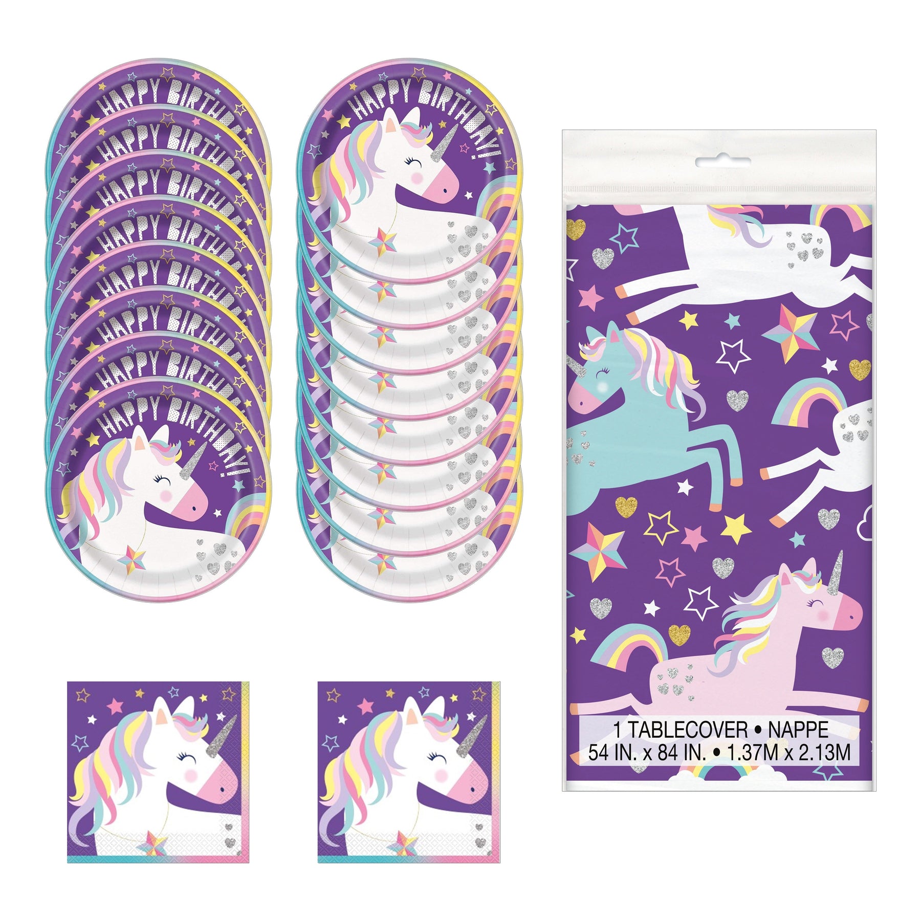 2. This enchanting pack contains everything you need to throw a mythical celebration for 16 guests. It features 2 packs of 8 Unicorn Dinner plates, 16 Unicorn Luncheon Napkins, and 1 stunning Unicorn Tablecloth.