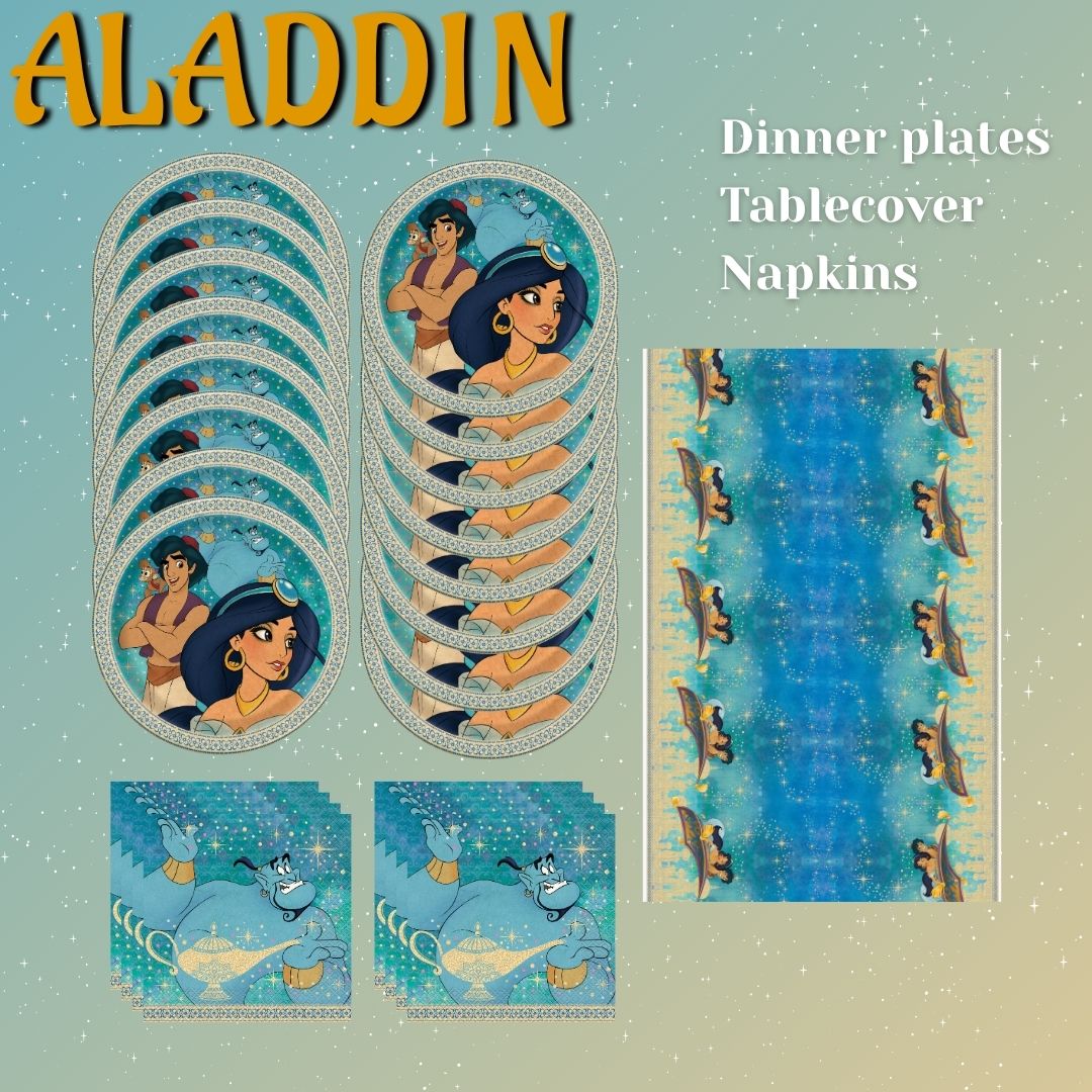 This enchanting Aladdin party supplies bundle includes 16 festive napkins, 8 dinner plates perfect for 8 guests, and a vibrant tablecloth.